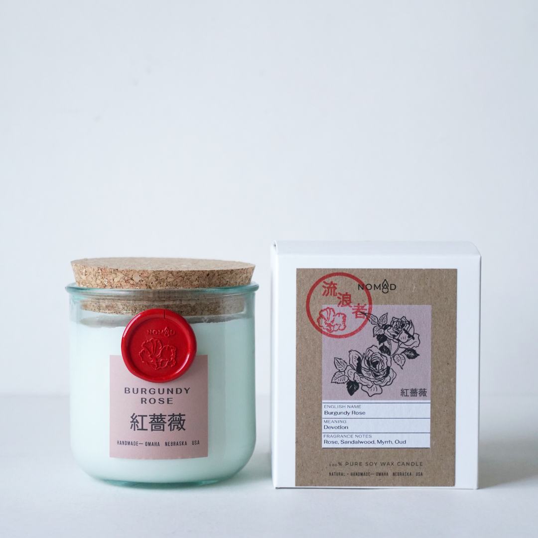 BURGUNDY ROSE is a lush, exotic and sensual scent. With light notes of rose petal balanced by the sweet notes of basil and blackberry, with grounding notes of earthy patchouli, sandalwood and oud, it is a sophisticated fragrance. The meaning of the Burgundy Rose flower is devotion so this candle makes an excellent gift for a lover, best friend or beloved family member.