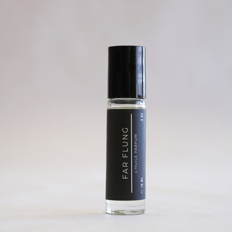 Far Flung is heady + seductive. Exotic night air, a world away. Seductive glances, pulsing rhythms, fabric caressing skin. Body heat ignites your heart; far-flung wishes granted. This scent is a sexy, warm tribute to intoxicating adventures and sultry moments. Our perfume oils are our most-concentrated personal scent with an intimate sillage.
