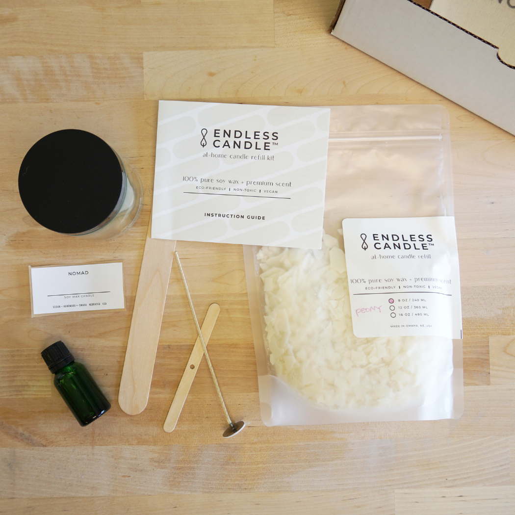 Endless Candle is the easiest, fastest, best-smelling way to refill your empty candle jars with luscious scent, right in the comfort of your own home. Our at-home candle refill kit comes neatly bundled with everything you need in one package. Each refill includes one melting bag of 100% pure soy wax, fragrance oil, and all supplies to refill your candle vessel. You simply provide a microwave (or stove, pot + water) and a few minutes of your time.